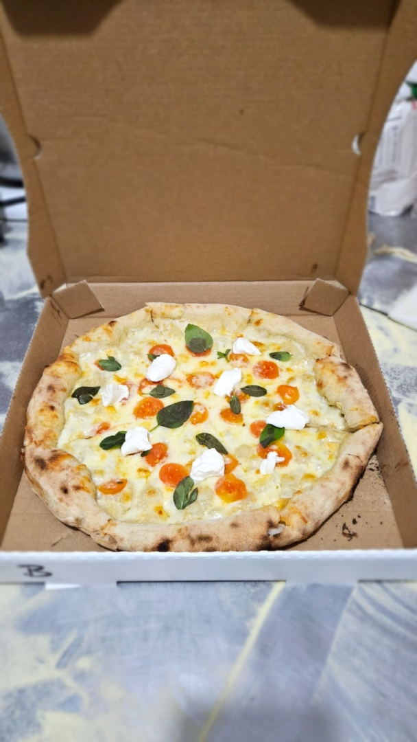 Molho de Tomate, Alho Fatiado, Manjericão, Orégano e Pimenta Preta Moída na Hora.