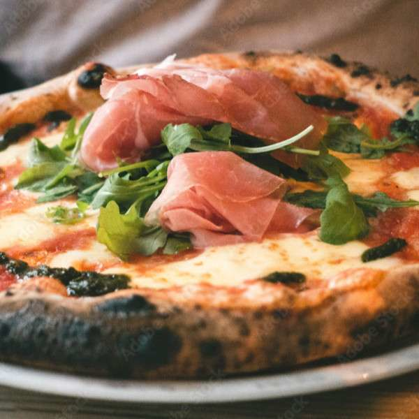 Pizza com molho de tomate napolitano, mozzarella de vaca, tomate-cereja, rúcula, manjericão, presunto parma e lascas de parmesão.